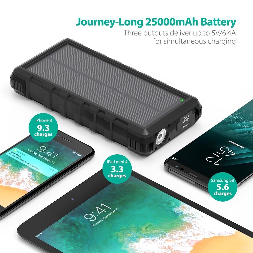 - Dung lượng cực lớn: 25.000mAh khi sạc đầy cho phép bạn sạc iPhone 8: 9.3 lần, Samsung Galaxy S8: 5.6 lần, iPad mini 4: 3.3 lần