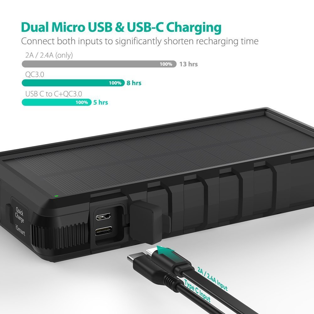 - Trong hộp có: 1 x RAVPower Solar Charger (Model: RP-PB083), 2 x Micro-USB Charging Cable, 1 x User Guide, 1 x Chân chuyển Micro USB - USB Type C