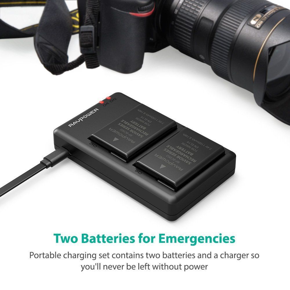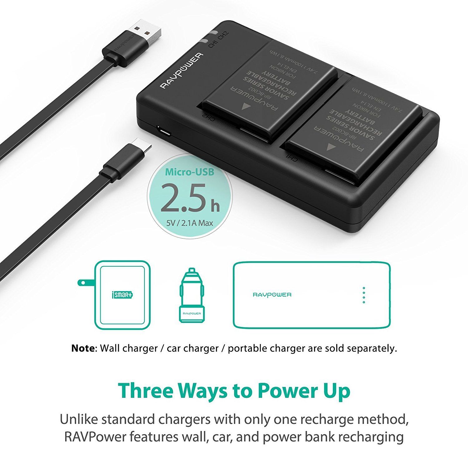 - Ba cách để tăng sức mạnh: Không giống như các bộ sạc tiêu chuẩn chỉ với một cách để sạc pin cho máy ảnh Nikon, RAVPower tính năng sạc với bộ sạc tường, tẩu sạc xe hơi và pin sạc dự phòng để thuận tiện hơn. Lưu ý: Tất cả ba bộ sạc được bán riêng